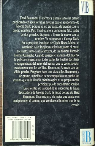 Stephen King sorprende y aterroriza una vez más al lector con su magistral don para destapar y exhibir la mitad más oscura del ser humano. Cuando Thad Beaumont en pleno bloqueo creativo, después de que su novela Las súbitas bailarinas optara al Premio Nacional de Literatura y lo perdiera, decidió seguir los consejos de su mujer y publicar una serie de thrillers retorcidos y sangrientos bajo el pseudónimo de George Stark, no pensó, ni por asomo, que le sería tan difícil «deshacerse» de ese otro yo que, no se explicaba cómo, había dejado de ser ficticio. Cuando el comisario Alan Pangborn aparece en su casa acusándole de un brutal asesinato...