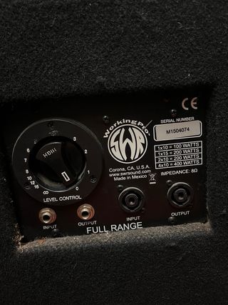 Pantalla de bajo SWR de 200W. - Modelo: WorkingPro 1x15. - tweeter con atenuador - entradas speakon y jack - Rejilla frontal metálica. - Cono orange label (el mismo que llevan las pantallas orange) - 8 ohms - Funciona como un tiro - Bien cuidado
