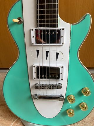 Guitarra estilo Les Paul con acabado Chevrolet. - Color: verde menta y blanco. - Incrustaciones en el mástil. - Pastillas dobles. - Puente cromado. - Controles dorados. Una guitarra muy chula, tocas y sonido muy autentico con funda. Ofertas sensible no menos de 270€