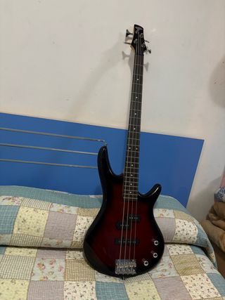 Bajo eléctrico de 4 cuerdas con un acabado degradado de rojo a negro. - Cuerpo con diseño ergonómico. - Mástil de madera oscura. - Pastillas dobles.