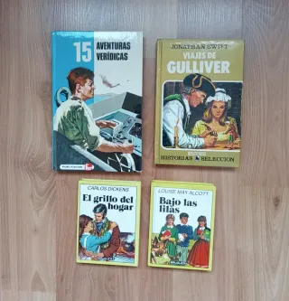 Lote 4 libros juveniles vintage de tapa dura,muy bien conservados. El lote 20€. *Viajes de Gulliver, edición 1985. *15 aventuras verídicas, edición 1977. *Bajo las lilas, 2° edición 1986. *El grillo del hogar, 1° edición 1986.