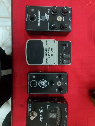 Conjunto de cuatro pedales para guitarra eléctrica. - Pedal reverb Abduction Atmosphere. - Pedal Behringer Noise Reducer NR300. - Pedal overdive Zeus.clon eathquacker - Afinador Boston BTU-500.