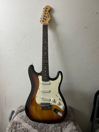 Guitarra eléctrica Academy con acabado Sunburst. - Cuerpo de madera. - Mástil de arce. - Diapasón de palisandro. - Tres pastillas single-coil. - Controles de volumen y tono.