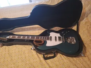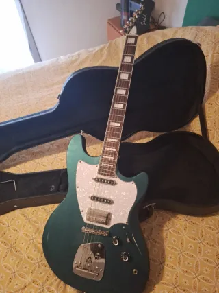 Guitarra eléctrica Guild Surfliner Deluxe en color verde oscuro. Incluye funda rígida. - Cuerpo de álamo seleccionado. - Mástil de arce tostado - Diapasón de palisandro. - Dos pastillas single-coil DeArmond, una humbucker Guild - Puente trémolo ajustable en dureza - Acabado a la cera de carnnauba (satinado con motas brillantes) - Muy cuidada y bien ajustada, electrónica cambiada con partes de calidad (CTS, Orange Drop, cable apantallado) - Afinadores de bloqueo. - Sonido extraorninario.