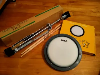 Kit de entrenamiento para batería TR-3, ideal para practicar. - Incluye caja sorda. - Soporte para la caja sorda. - Baquetas Vic Firth SP4 COMBO. Usado en una ocasión, lo único malo es que la caja se encuentra rota
