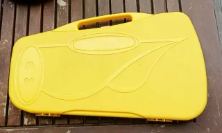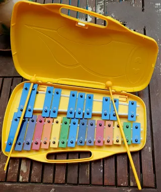 Xilófono infantil con estuche amarillo. Incluye dos baquetas para tocar. - 25 notas metálicas de colores. - Estuche amarillo de plásico. - Baquetas amarillas.