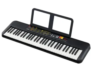 Piano Yamaha en color negro, ideal para iniciarse en la música. Incluye el soporte para partituras y pie. - Teclado de 61 teclas. - Altavoces integrados.