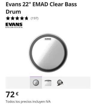 Parche para bombo de batería marca Evans, modelo EMAD. - Diámetro de 22 pulgadas. - Acabado transparente. Muy poco uso. Regalo accesorios.