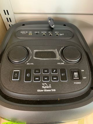 Altavoz acústico Sytech Glow Glass 518 con 240W de potencia. Incluye micrófono inalámbrico. - Conector de guitarra. - Puerto USB y Micro SD. - Sincronización TWS para 2 altavoces. - Prioridad de micrófono. - Batería recargable. - Mando a distancia incluido. DAMOS 3 AÑOS DE GARANTÍA. Estamos en Paseo de Extremadura, 46 de Lunes a Sábado. G5991