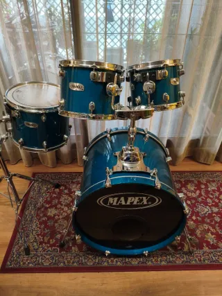 Batería Mapex M Pro La Mapex Pro M es una batería acústica de gama media-alta hecha con cascos de arce (maple) de 7 capas en color rojo burdeos. Un set brutal conocida por su sonido potente y buena resonancia. Incorpora sistema de suspensión I.T.S. para los toms, aros Powerhoops de acero y herrajes robustos. - Bombo 22” mapex m pro - Caja 14” mapex m pro - Tom 1 10” mapex m pro - Tom 2. 12” mapex m pro - Tom 3 13” Rogers - tom 4 14” mapex m pro - floor tom 16” Rogers . Corral Pearl con 7 pinzas de sujeción. Juego de platos paste alpha hihat 14”, splash 10”. Crash 14”, 16” y ride 2 Pedal gibraltar Pie Hihat y caja