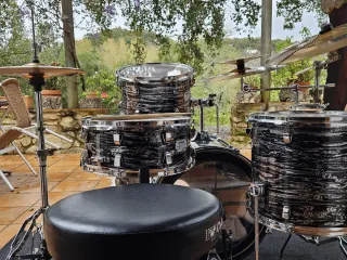 Conjunto de batería acústica en acabado dorado, incluye: - Bombo (se ofrece aparte un segundo parche de 22” ) - Tom de suelo. - Tom de rack. - Caja - 3 soportes de platos charlie, corte, y ritmo ( pero los platos no están a la venta ) se vende también por piezas y se puede probar precio negociable
