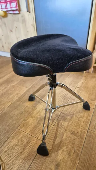 Banqueta para batería con altura regulable. - Asiento acolchado. - Base metálica con tres patas. - Altura ajustable mediante rosca. - Poco utilizado