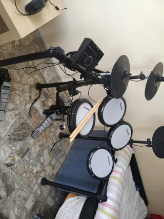 PRECIO NEGOCIABLE. Batería eléctrica de 4 años, aunque diria que está en perfecto estado (ya que estan hechas para ser aporreadas). La quiero vender porque ahora toco la batería acústica. El kit incluye: -bombo y su pedal -caja + 3 timbales - Hi-hat, crash, ride - Main machine o panel de control - Alfombra insonorizante, 94 € en primera mano (Al tocar el bombo, toda la vibración se transmite al suelo y los vecinos lo notan). El panel de control tiene muchos sonidos de batería, además de un metrónomo y ejercicios (y la máquina te dice si lo has repetido bien o no). Los timbales y la caja son ajustables para imitar parches reales.