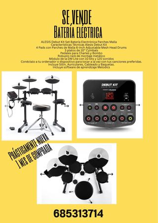 Batería electrónica Alesis Debut Kit. Batería perfecta para principiantes o aquellos que buscan un kit silencioso, tiene uso pero se conserva en buenas condiciones, viene con todos los elementos excepto el sillín, baquetas y el interruptor de bombo. El pedal se puede comprar por separado desde unos 15€, simplemente busca "alesis debut kit pedal bombo" en el buscador y verás algunas opciones.