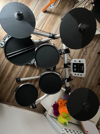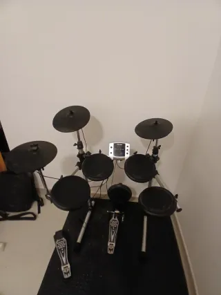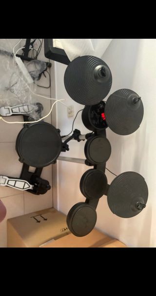 Batería electrónica completa, ideal para practicar en casa. Esta completamente nueva. - Pads de goma y malla. - Platos de charles, crash y ride. - Módulo de sonido. - Pedal de bombo. - Soporte para caja y platos.