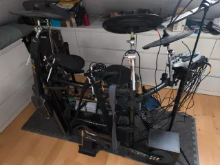 Kit completo MPS-750. A diferencia del estándar, cuenta con: 4 platos y 4 tambores de malla + un soporte de Hi-Hat real. Incluye pedal de bombo original, sillín ajustable y unas baquetas nuevas. Funciona todo a la perfección: entradas de sonido, salidas para ampli y salida de auriculares. Los defectos por uso son los que se podrían observar en las imágenes. El módulo todavía conserva la pegatina de protección original de la pantalla. Partes individuales con pegatinas y cables numerados para facilitar montaje (se pueden retirar). Preferencia de entrega en mano (valencia), pero opción de envío. Se soluciona cualquier duda!
