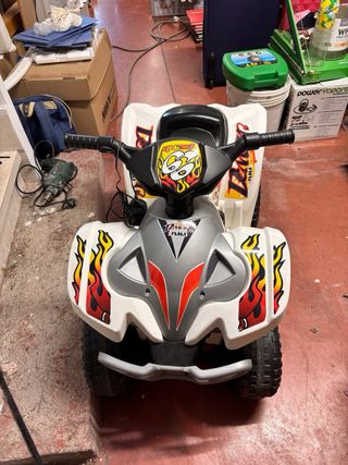 Quad eléctrico infantil con diseño deportivo y llamativo. En perfecto estado para ser usado a mi hijo se le ha quedado pequeño. le dio mucho uso desde los 2 años y medio hasta los 4 y pico. batería adicional aunque la que tiene funciona. exterior tal y como se ve en las fotos.