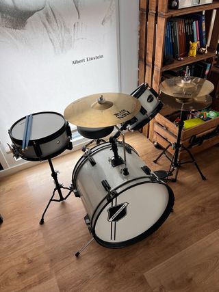 Conjunto de batería completo para niños, ideal para iniciarse en la música. Incluye todos los elementos necesarios para empezar a tocar. Comprada en tienda musical por más de 300€