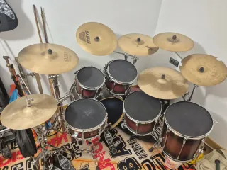 Se vende batería Tama completa, ideal para músicos. - Incluye varios tambores y platillos. - Color madera oscura.