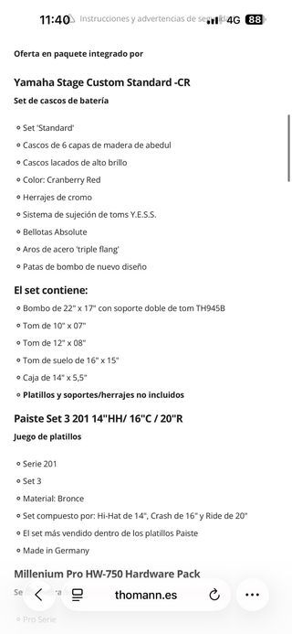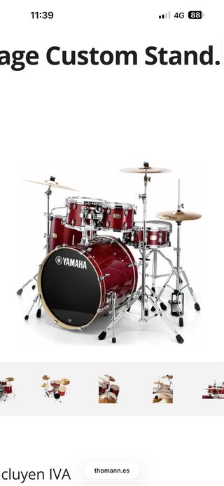 Batería Yamaha en color negro, en perfecto estado. Incluye 5 platos, sillín y pedal. Batería Yamaha Stage Custom Burh. En color negro brillante, compuesta de: - Bombo 20p. - Caja 14p. - Tom base 16p. - Tom 12p. - Tom 10p. - Crash Sabian 16p. - Hi Hat Meinl Classic Custom cc15 mmb. - Plato Paiste Signature Precision R20. - Plato Istambul 18p. - Crash Radiant Medium. - Soportes Gibraltar y brazo adaptador de platos. - Cencerro LP Rok LP. - Soporte cencerro GWA CLB Salsa. - Taburete de batería Gibraltar.