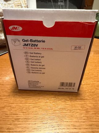Batería de gel para moto, modelo JMTZ8V. ( NUEVA sin estrenar ) - Voltaje: 12 V - Capacidad: 8 Ah - Potencia: 96 Wh - Corriente de arranque en frío (CCA): 110 A - Tecnología 3D-Gel Micro-Tech. Yamaha, honda , aprilia,bmw.