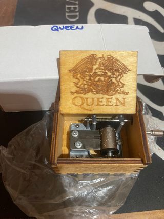 Caja de música de madera con el logo de Queen. - Diseño grabado con el escudo de Queen. - Mecanismo musical visible.