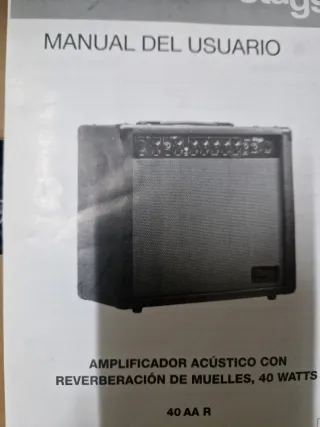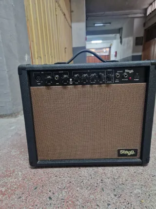 Amplificador Stagg para guitarra con acabado en negro y rejilla marrón. - Entrada para micrófono (MIC). - Entrada para guitarra (GUITAR). - Controles de ecualización (EQ). - Entrada auxiliar (AUX INPUT). - Salida para auriculares (PHONES). - Control de reverberación (REVERB). - Interruptor de encendido (POWER).