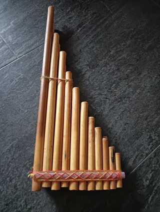 Instrumento musical tradicional de viento, conocido como zampoña, siku o flauta de pan. Fabricado con tubos de caña de diferentes longitudes. - Material: Caña. - Diseño: Conjunto de tubos de diferentes tamaños unidos. - Decoración: Banda tejida en la base con hilos de colores. -47cms de largo