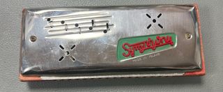 Armónica vintage de la marca Symphony, fabricada en Polonia. Un instrumento clásico con un diseño distintivo. - Cubierta metálica plateada. - Detalle de notas musicales grabadas. - Insignia Symphony en color rojo y verde. - Orificios de ventilación en forma de cruz.