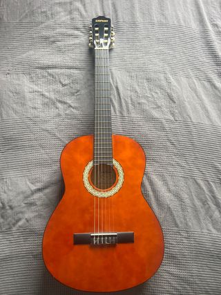Guitarra acústica de color naranja brillante. Ideal para principiantes o para tener un instrumento adicional. - Cuerpo de madera. - Diapasón de madera oscura. - Seis cuerdas de nylon.