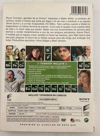 Primera temporada completa de Breaking Bad en formato DVD. - Incluye la temporada completa. - Ganador del Emmy al Mejor Actor en Serie Dramática para Bryan Cranston.