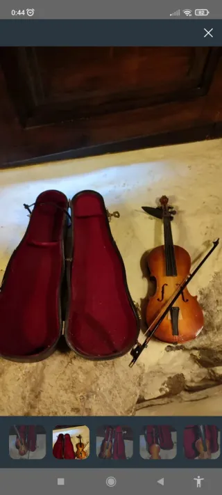 Pequeño violín con su estuche y todos los complementos. - Violín de tamaño reducido. - Incluye estuche. - Accesorios para tocar el violín. Pieza muy bonita Medidas en fotos