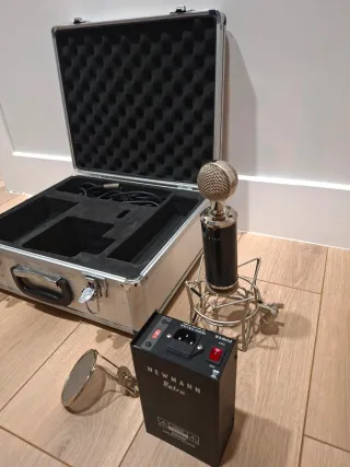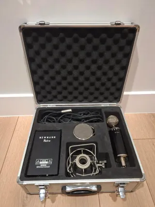 Se vende micrófono profesional Neumann Retro en su estuche. - Incluye micrófono, caja de alimentación, araña y cable. - Estuche rígido con interior de espuma. - Diseño clásico y elegante.