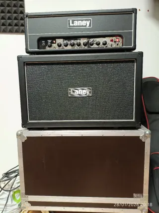Cabezal a válvulas para guitarra LANEY GH50R. 50W. Edición limitada con tolex negro y granate. Todo válvulas ( ECC83/EL34 ). 2 canales. Controles de Bass/Mid/Treble con Pull-Shift en medios. Master output. Master tone. Reverb con Pull-Focus. Loop de efectos con Mode Switch. Canal y reverb selecionable desde la pedalera (FS2 incluida). Entrada Aux In. pantalla gs212vr con dos conos de 12" Celestion vintage 30. Incluido flight case echo a medida para pantalla y cabezal. En perfectas condiciones. Debido al peso y tamaño no hago envíos.