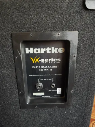 Pantalla de bajo Hartke VX Series – VX410 (importante: no es cabezal, es la pantalla). Sonido potente y con pegada, típica 4x10: graves firmes, medios con punch y tweeter para más definición/slap. Configuración: 4x10” + tweeter Conexiones: 2 x jack 1/4” (Input + Extension / paralelo) Funciona perfectamente: los 4 altavoces y el tweeter van bien, sin ruidos ni “rascado”. Estética con marcas normales de uso en moqueta/esquinas (ver fotos). Ruedas desmontables añadidas a posteriori: se quitan/ponen, y quedan fijas en uso normal Recogida en mano en Barcelona (zona Trinitat Nova). Se entrega tal cual está. Precio no negociable.