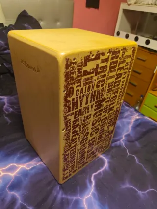 Cajón de percusión con un diseño artístico y llamativo. Ideal para explorar ritmos y estilos musicales. - Diseño con tipografía Rhythm & Blues. - Acabado en madera clara con letras en marrón. - Incorpora elementos gráficos de instrumentos musicales. - Usado Solamente El día de Navidad . - Precioso Cajón Flamenco - Nada Negociable