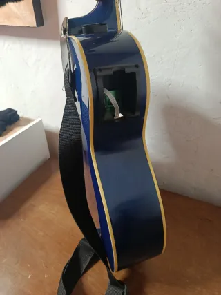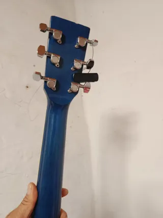Guitarra Dimavery de color azul con detalles en madera. - Correa negra incluida. - Compartimento para electrónica visible.