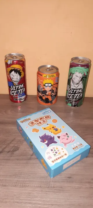 Pack de comida temática de anime japonés. - Tres latas de Ultra Ice Tea con personajes de One Piece y Naruto. - Caja de dulces o snacks de Pokémon.
