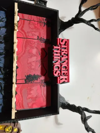 Expositor temático de Stranger Things, inspirado en el Upside Down y el mundo real. - Diseño dividido en dos partes: azul oscuro (Upside Down) y rojo (mundo real). - Incluye elementos decorativos como árboles y el logo de la serie. - Pequeño reloj de pie decorativo.