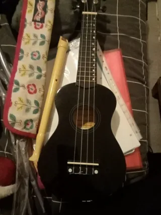 Ukelele Martin Smith en color negro, con varios rayones de el uso incluye funda. - Funda con diseño floral. - Incluye un accesorio musical amarillo.