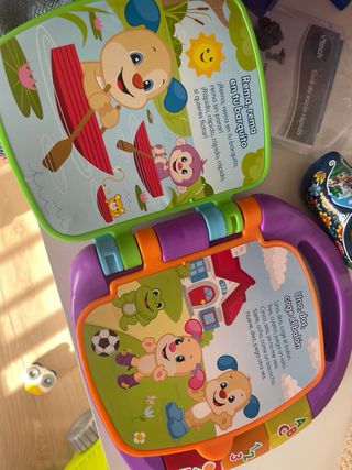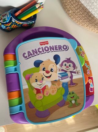 Libro interactivo Cancionero de Fisher-Price, diseñado para los más pequeños. Presenta personajes alegres y colores vibrantes. - Portada con el logo de Fisher-Price. - Ilustraciones de animales y objetos. - Páginas con texturas y botones.