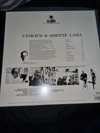 Disco de vinilo Vinicius & Odette Lara del sello Elenco. - Edición Limitada Collector's Reissues de 180 gramos. - Músicas de Baden Powell e Vinicius, arreglos e regência de Moacir Santos. Carpeta y vinilo impecables, funda protectora. Ideal para coleccionistas.