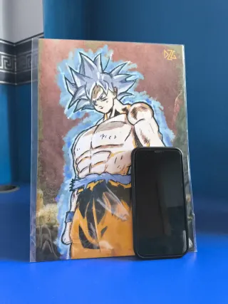 Póster de anime con Goku en su forma de Ultra Instinto. Presenta un diseño vibrante y detallado. - Ilustración de Goku. - Estilo de arte anime. - Colores llamativos. - Sin abrir
