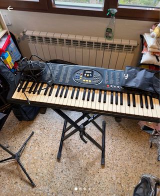 Piano electrónico portátil con su cargador y patas de apoyo. - Teclado de 61 teclas. - Pantalla digital. - Incluye cargador. - Patas de apoyo plegables. Porta partituras