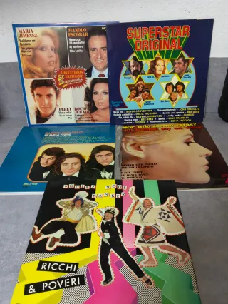 Colección de vinilos antiguos con una variedad de éxitos musicales. - Superstar Original con artistas como Giorgio, Bee Gees y John Travolta. - Los Últimos Éxitos de Cancioneros con Maria Jimenez, Manolo Escobar, Peret y Rocio Jurado. - Quiero Ser Feliz de Rumba Tres. - Voulez Vous Danser de Ricchi & Poveri.