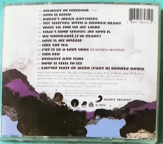 Cd + DVD "The Element of Freedom" de Alicia Keys, Edición Deluxe. En buen estado CD-1 Element Of Freedom (Intro) CD-2 Love Is Blind CD-3 Doesn't Mean Anything CD-4 Try Sleeping With A Broken Heart CD-5 Wait Til You See My Smile CD-6 That's How Strong My Love Is CD-7 Un-thinkable (I'm Ready) CD-8 Love Is My Disease CD-9 Like The Sea CD-10 Put It In A Love Song Featuring – Beyoncé CD-11 This Bed CD-12 Distance And Time CD-13 How It Feels To Fly CD-14 Empire State Of Mind (Part II) Broken Down. Bonus Tracks CD-15 Through It All CD-16 Pray For Forgiveness Bonus Tracks Dvd