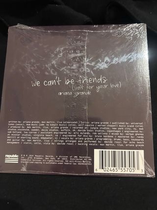 Ariana Grande – we can’t be friends (CD Single – Eternal Sunshine Deluxe) ✨ Edición limitada, importada de USA 📀 Formato: CD Single (nuevo y precintado) 🌎 Exclusiva de la tienda oficial de Ariana Grande Estado: 100% nuevo, sin abrir. Listo para envío inmediato 🚚 — se envía mañana mismo. Perfecto para coleccionistas y fans de Ariana.