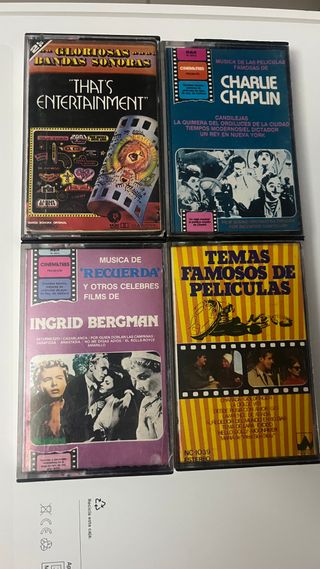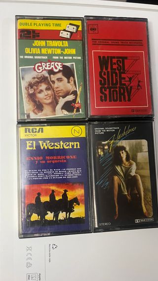 Casettes de Bandas sonoras. Soundtracks Flashdance, Grease, Went Side Story (vendido), Laura, Hatari, Western, Chaplin, Ingrid Bergman, Marilyn Monroe, etc Ver fotos. 4 euros cada cinta. Envío mínimo de 3 cintas.