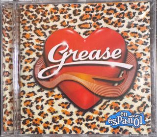 Este CD contiene la banda sonora del musical Grease en español. La portada presenta un diseño llamativo con un fondo de estampado de leopardo y un corazón rojo. - Título: Grease en español - Formato: CD