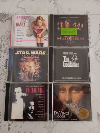 Vendo cinco (5) CDs de bandas sonoras originales en buen estado. - Incluyen las bandas sonoras de Titanic, La Casa de los Espíritus, Forrest Gump, y Star Wars Episodio II: El Ataque de los Clones. - También se incluye un CD adicional de Carlos Núñez. - Son CDs originales.